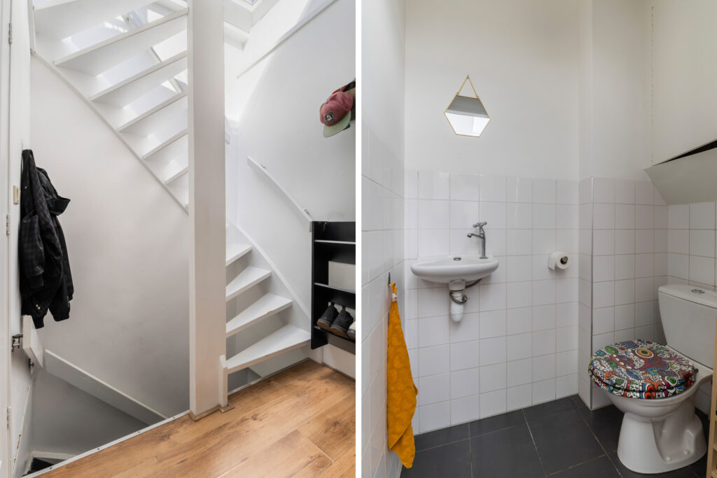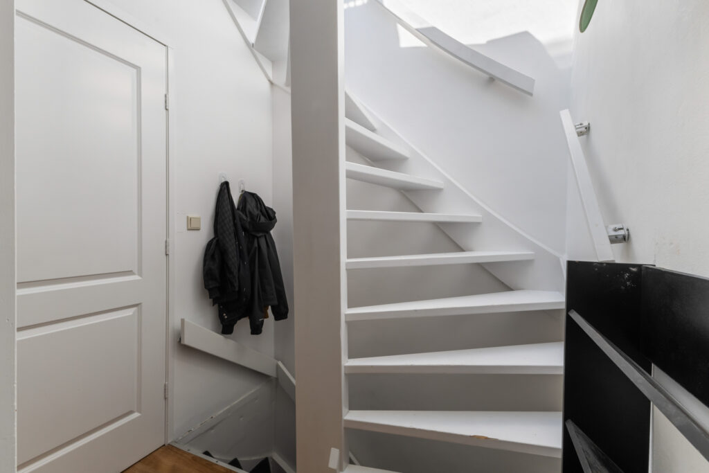 Entree van het appartement met hier een plekje voor de garderobe en de trap naar de tweede verdieping.