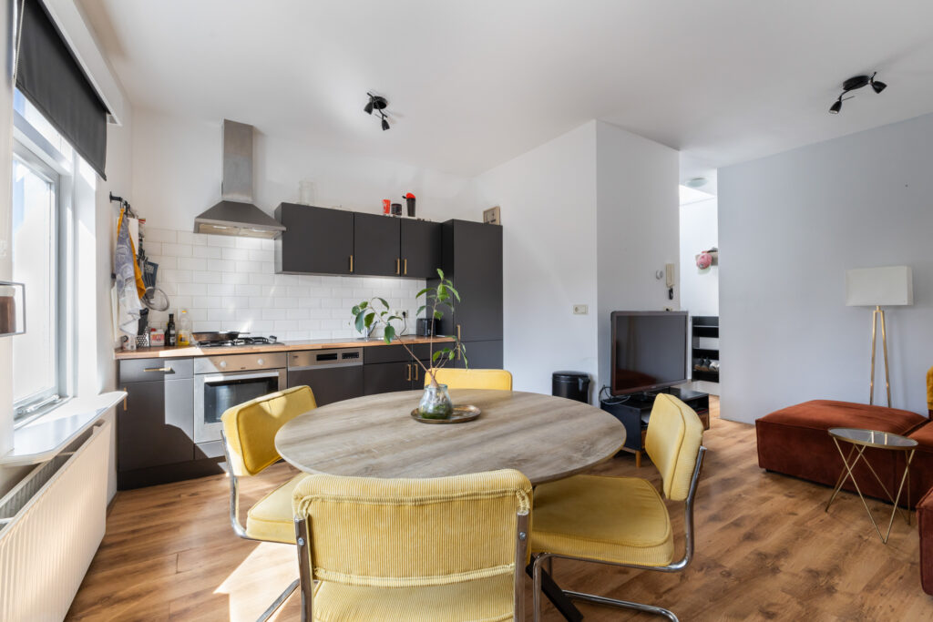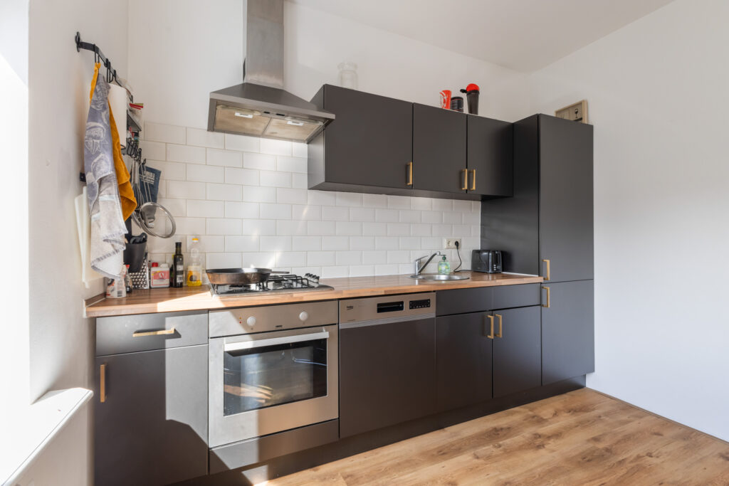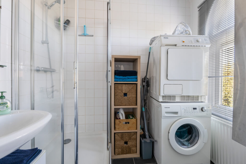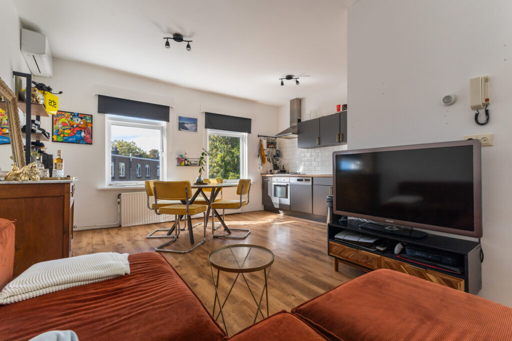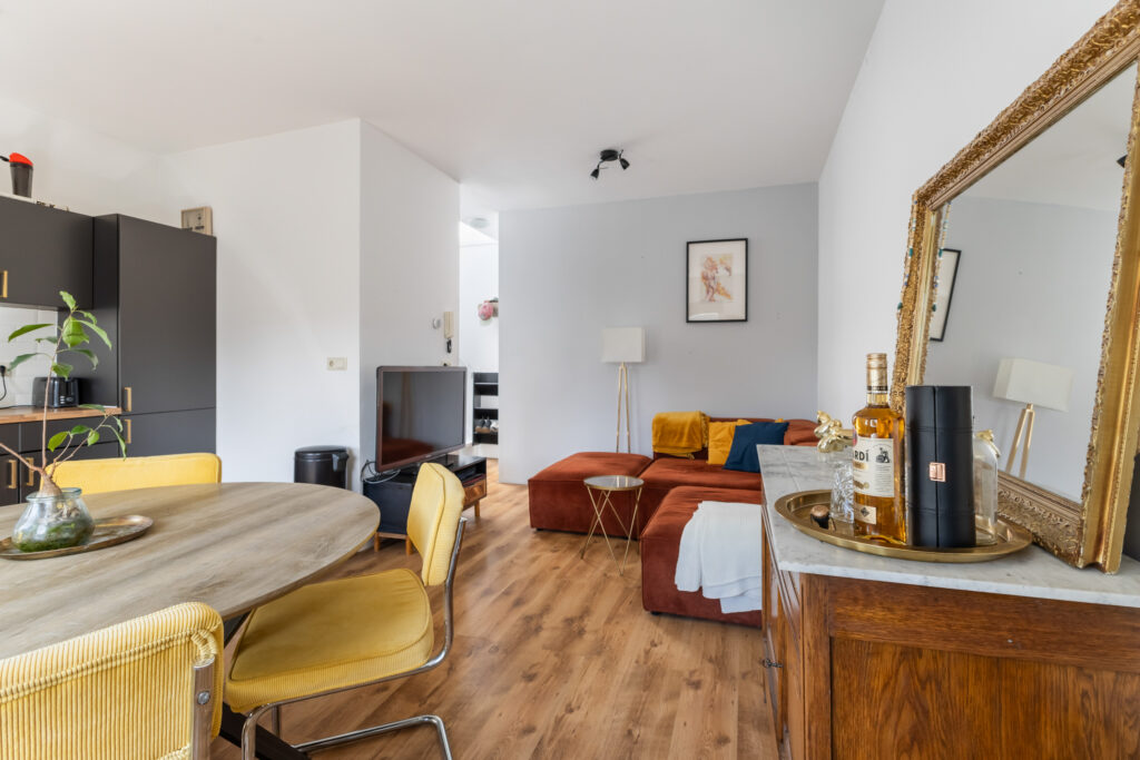 Naar de achterzijde tref je de woonkamer met een moderne open keuken. Een gezellige plek voor etentjes en de woonkamer om te zitten. Achter kijk je leuk uit op de terrassen en tuinen van de achtergelegen woningen. Het zonnetje komt in de middag hier vrolijk naar binnen. De badkamer is voorzien een douche, vaste wastafel en een aansluiting ten behoeve van de wasmachine. Het toilet met fontein ligt separaat en bereikbaar je vanaf de overloop.