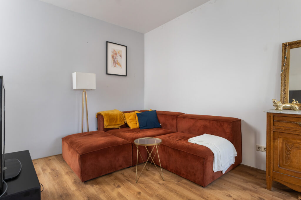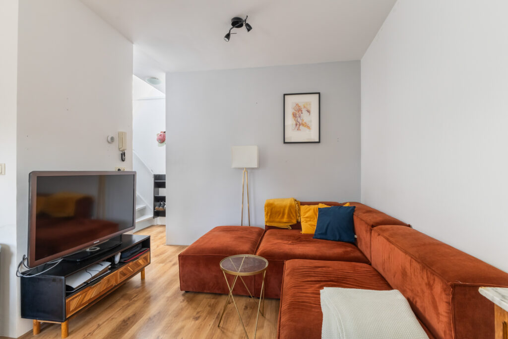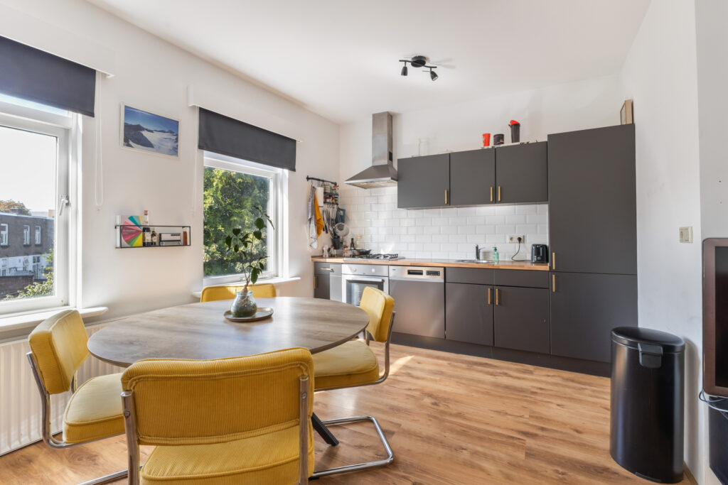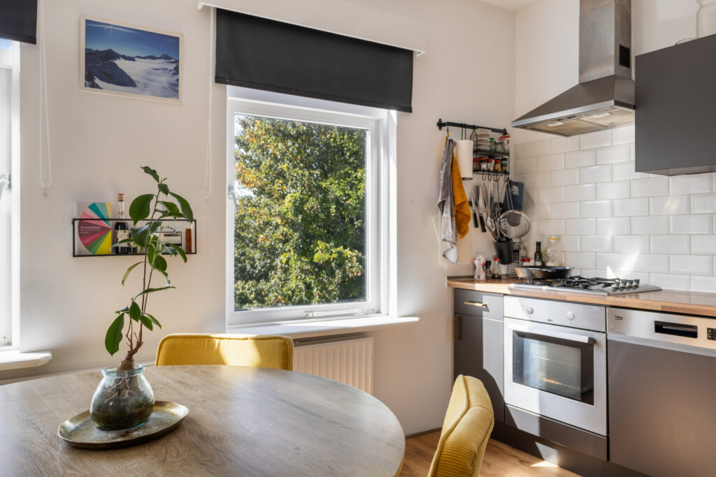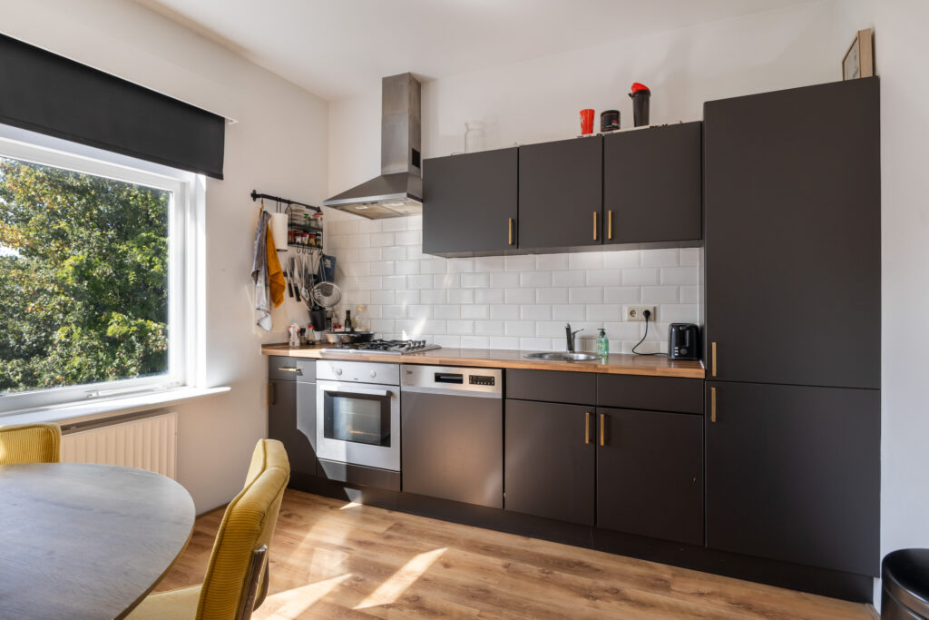 Naar de achterzijde tref je de woonkamer met een moderne open keuken. Een gezellige plek voor etentjes en de woonkamer om te zitten. Achter kijk je leuk uit op de terrassen en tuinen van de achtergelegen woningen. Het zonnetje komt in de middag hier vrolijk naar binnen. De badkamer is voorzien een douche, vaste wastafel en een aansluiting ten behoeve van de wasmachine. Het toilet met fontein ligt separaat en bereikbaar je vanaf de overloop.
