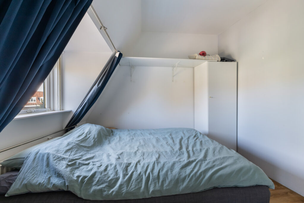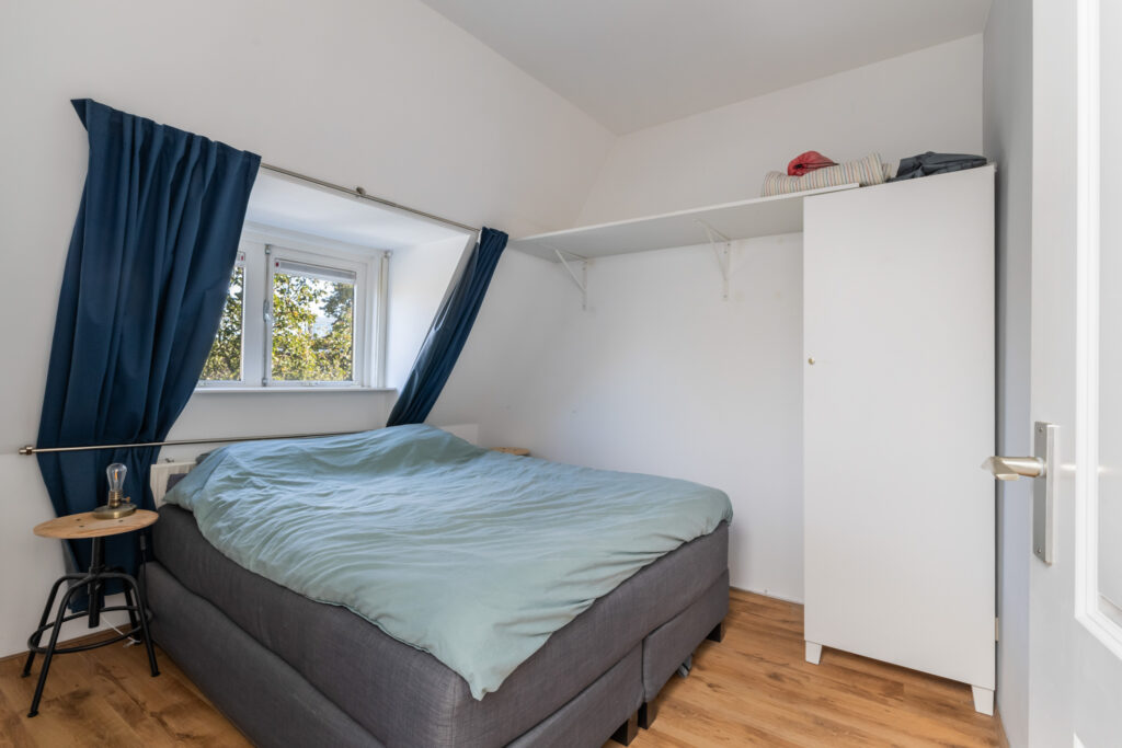 De slaapkamer bevindt zich aan de voorzijde en biedt plek aan een groot tweepersoonsbed en een kledingkast.