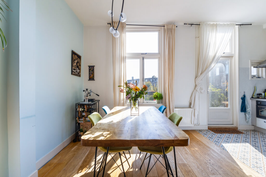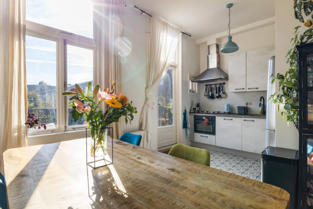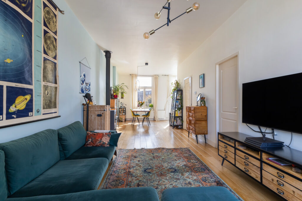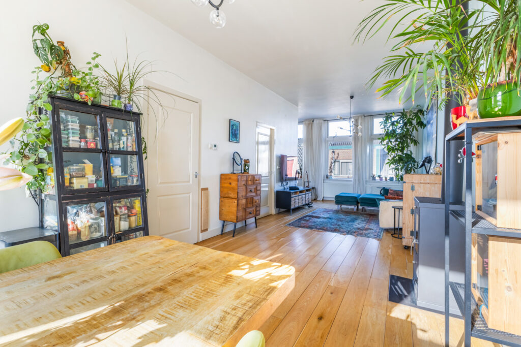 Hier voel je je direct thuis. De ruime woonkamer heeft een fijne lichtinval en biedt voldoende plek voor een comfortabele zithoek. Aan de achterzijde bevindt zich de sfeervolle eetkeuken, perfect voor gezellige diners met vrienden of familie. Via de openslaande deuren bereik je het zonnige balkon op het zuidoosten, waar je heerlijk kunt genieten van de ochtend- en middagzon.