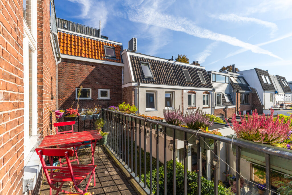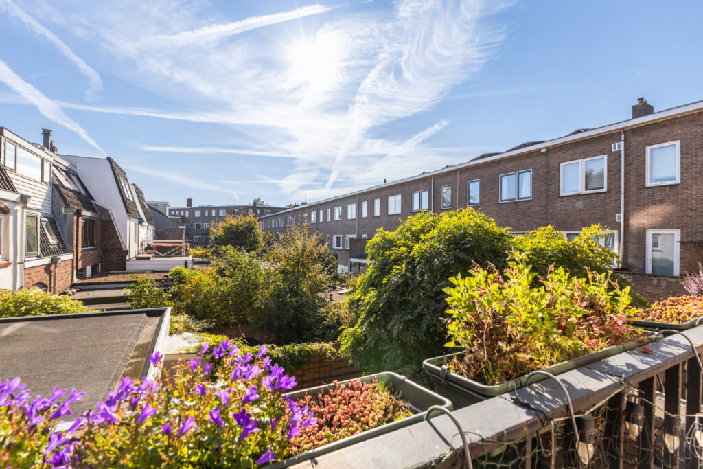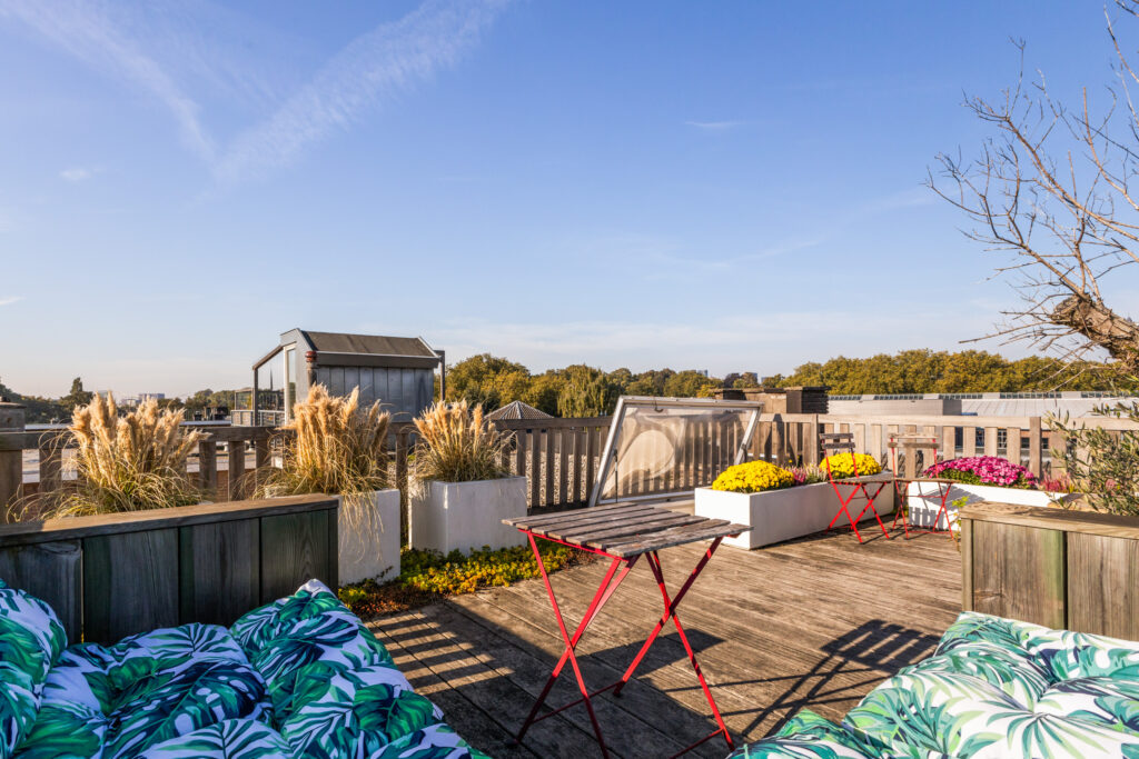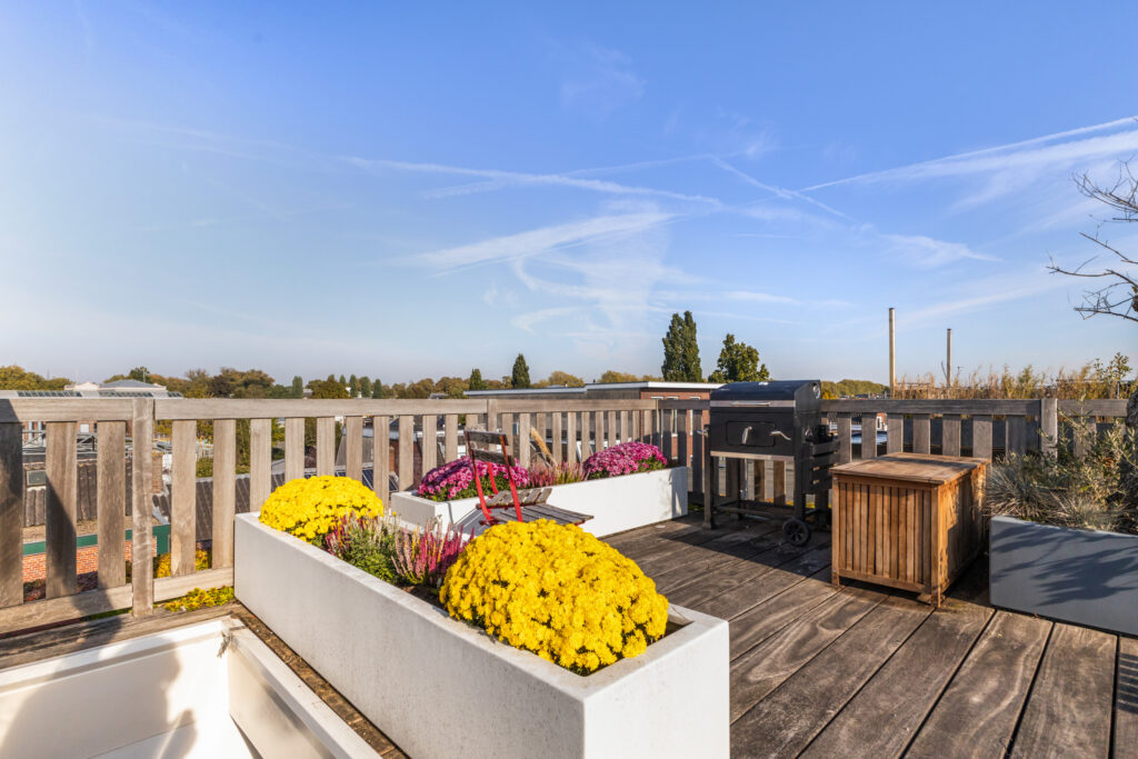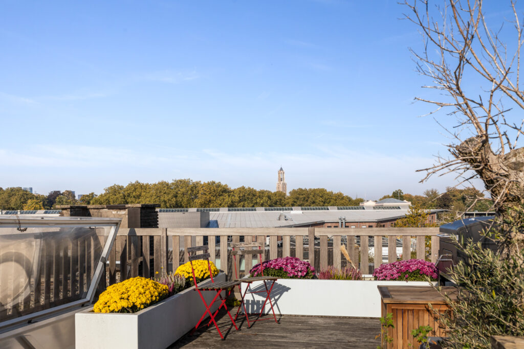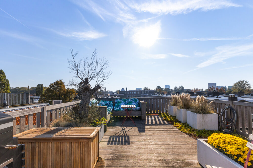 Via de tweede verdieping bereik je het royale dakterras van circa 4,67 x 6,45 meter. Een geweldige plek om in alle rust van de zon te genieten, te borrelen of buiten te dineren met uitzicht over de stad.