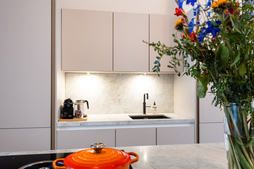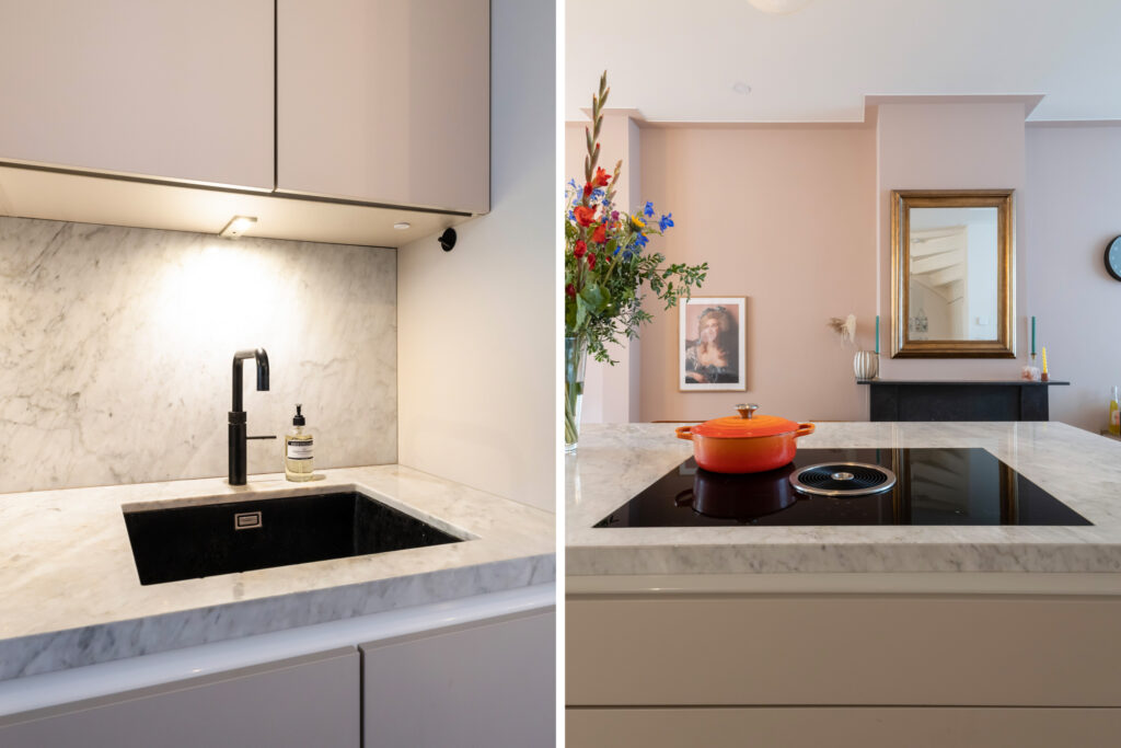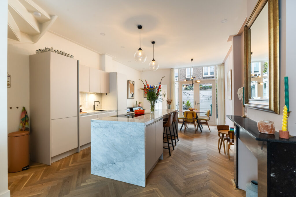 Via de entree met meterkast en trapopgang kom je binnen in de royale, sfeervolle living, voorzien van vloerverwarming en een elegant visgraatparket. De open woonkeuken is een echte eyecatcher met zijn marmeren aanrechtblad, het ruime kookeiland en de moderne apparatuur — waaronder een koelkast, vriezer, vaatwasser, Quooker, oven en Bora-inductiekookplaat — geven de keuken een luxe en uitnodigende uitstraling.